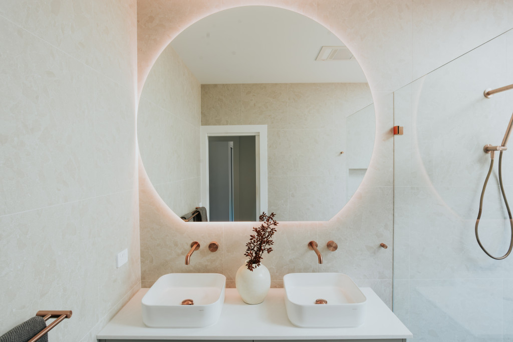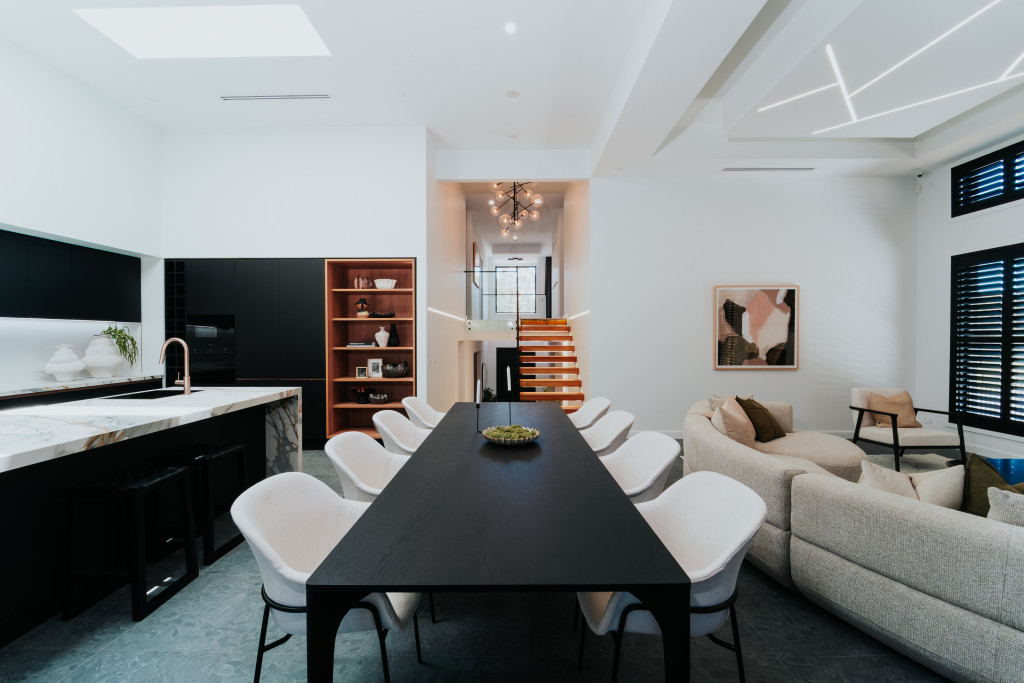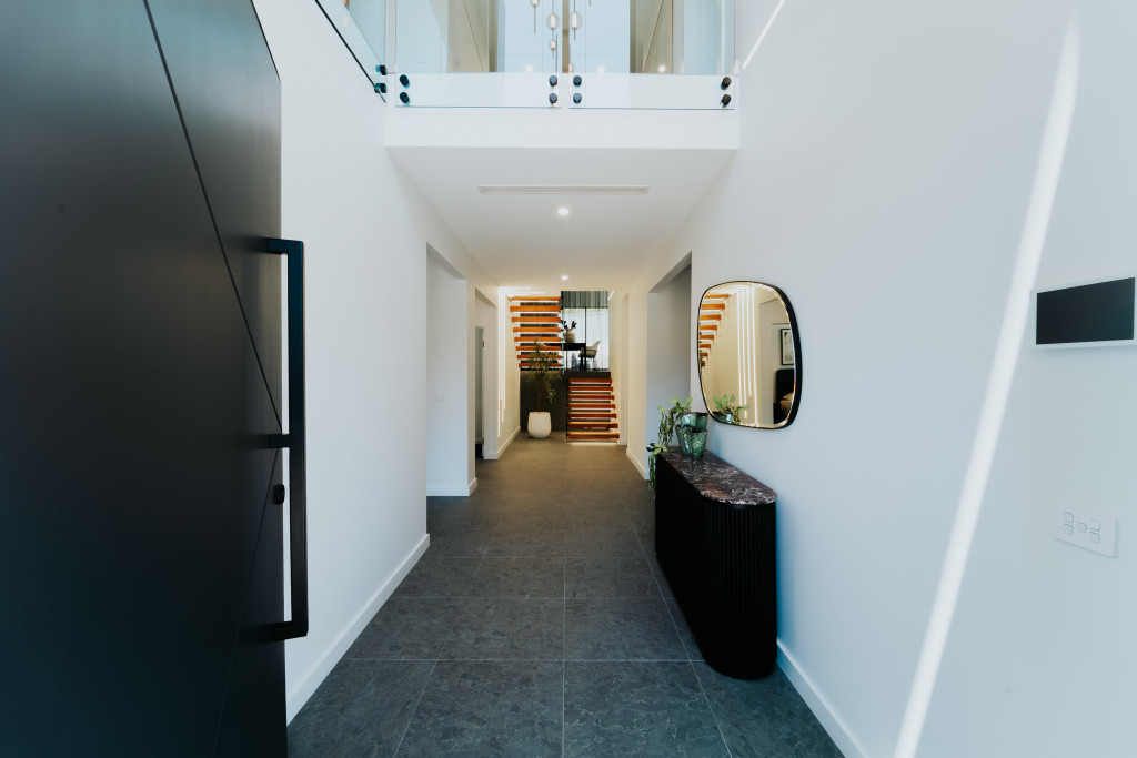 Entering the home on the lower level, you find a lounge room or office, 2 bedrooms and a bathroom before heading upstairs to the open plan living space where a huge kitchen including island bench and butler’s pantry overlooks the dining and family areas. An undercover alfresco area brings the outdoors in, creating a luxurious, relaxed, flowing space.