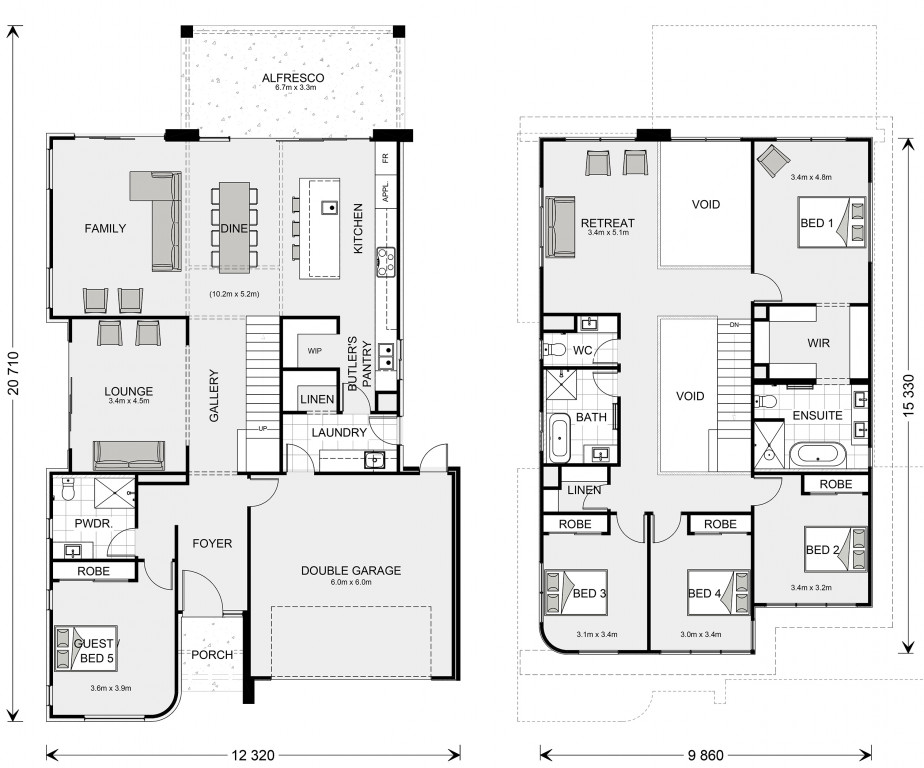 Luxurious and spacious are two words that describe the gourmet kitchen and butler’s pantry, overlooking the family and dining that extend outdoors to a huge alfresco, making entertaining a flowing, enjoyable experience. The central voids accentuate the sense of space and grandeur that form the main living area of this impressive home. Relax and unwind in the central lounge room with sliding doors that open to a private courtyard to enjoy some quiet reflection, watch a movie or soak up the morning sunlight.