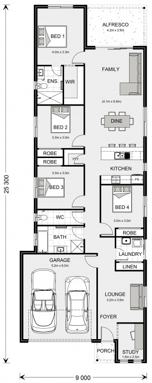 The Albany design is a stylish and practical four-bedroom home, perfect for narrow sites.