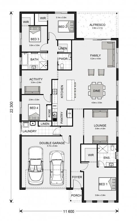 This stunning home design features three living zones, including a separate area for the kids, a master retreat and a large, open-plan living space topped with a separate lounge room allowing for space, privacy and entertaining.