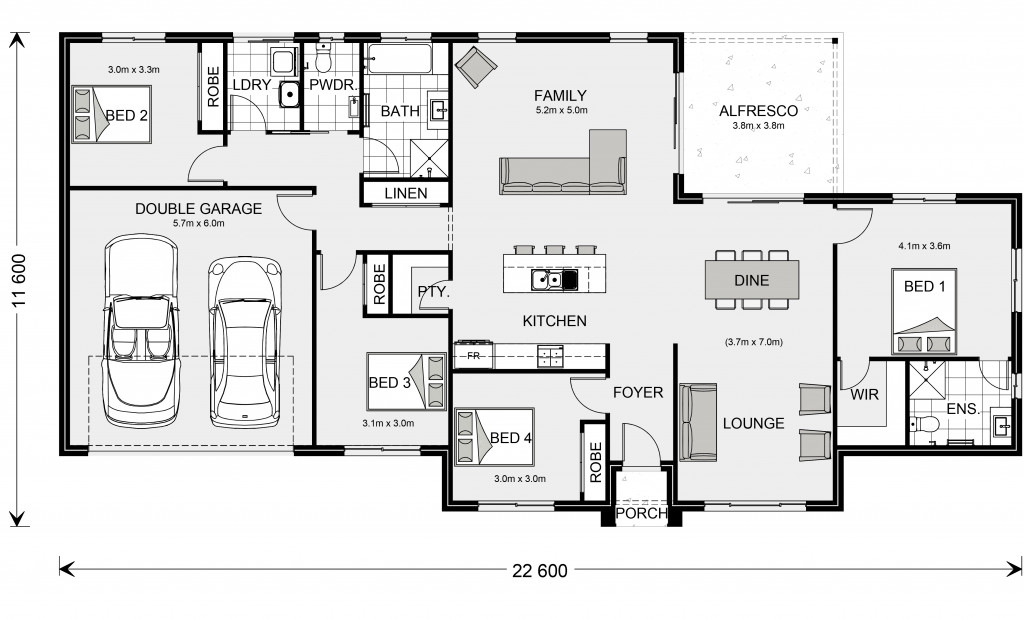 The Wishart design boasts generously sized bedrooms, each thoughtfully designed to provide comfort and privacy. The master suite is a true retreat, privately located on one side of the home features a luxurious ensuite and a walk-in robe, offering a serene escape from the hustle and bustle of daily life. On the opposite side, additional bedrooms share a central bathroom, ensuring convenience and privacy for all family members.