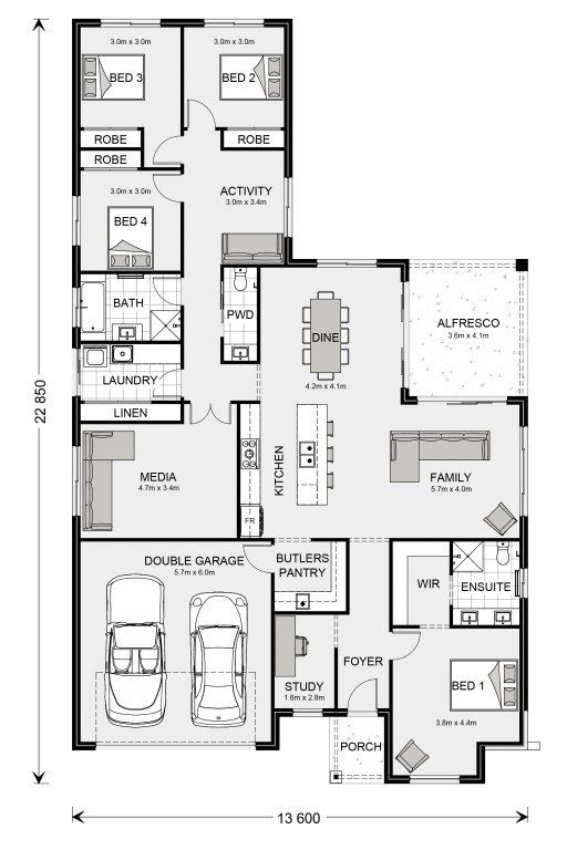 Main features of the luxury layout include, a separate media room, an open plan family room, an activity room and master suite, all sporting an abundance of space. The spacious and breathable home layout contrasts to the private and secluded bedrooms perfect for personal retreats and desired alone time.
