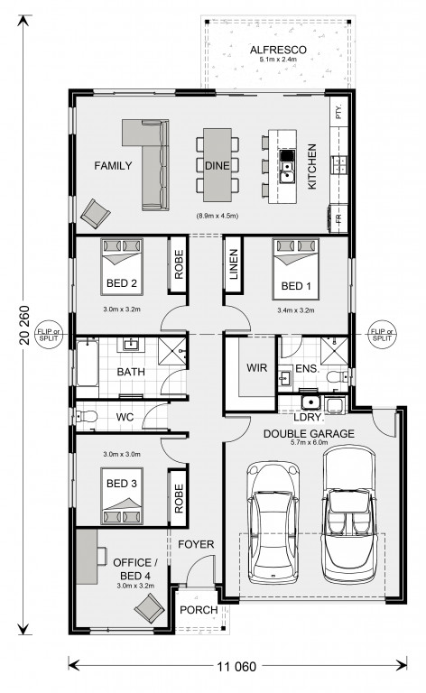 For optimal site use, this design is best positioned on sites with the north aspect towards the rear of the home, providing sustainable and comfortable living conditions throughout the year.