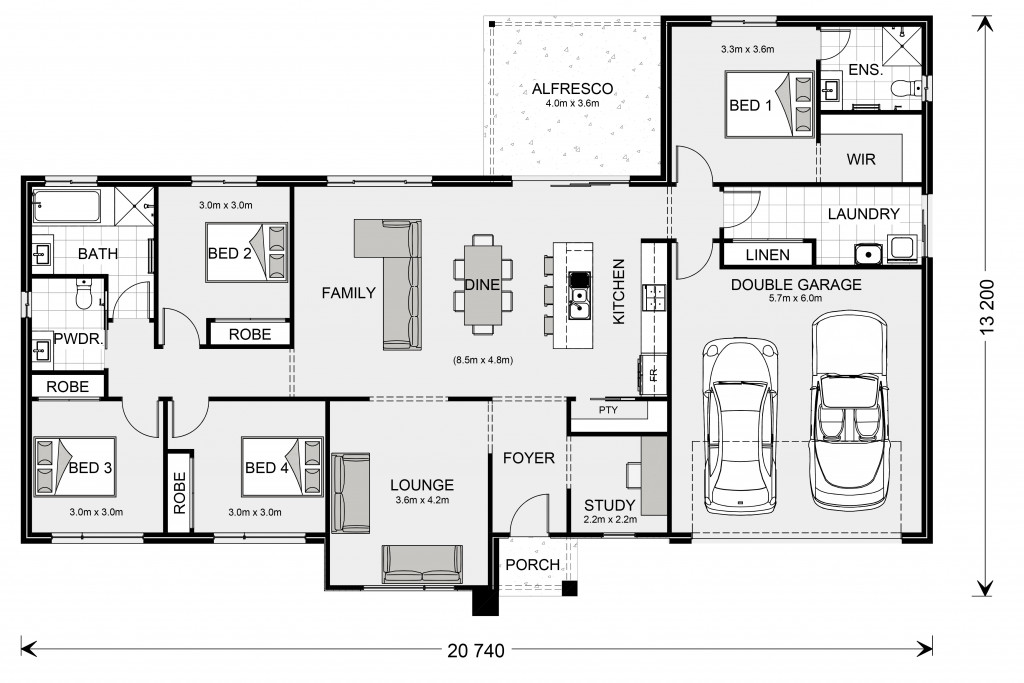 Ideally suited to wider or rural sites, the Sutherland has a unique layout perfect for the entire family and comes with four spacious bedrooms including a master suite complete with an ensuite and a walk-in robe.